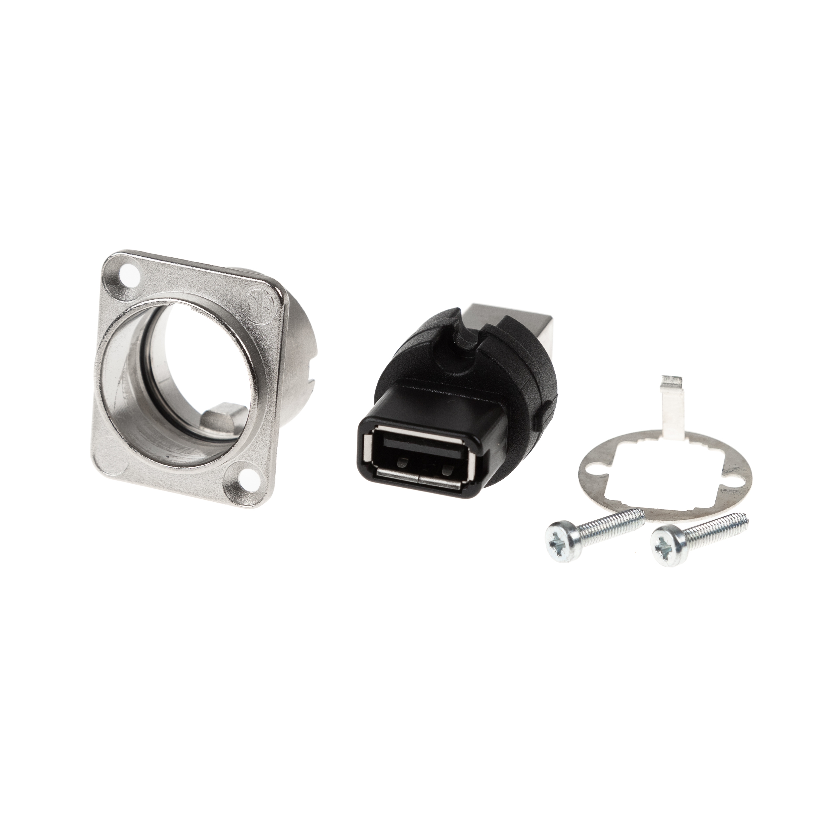 Mountable USB adapter for industrial applications (wall outlet, screw-on type) , A female to B female (pivotable receptacle core, A or B at front side), colour: silver