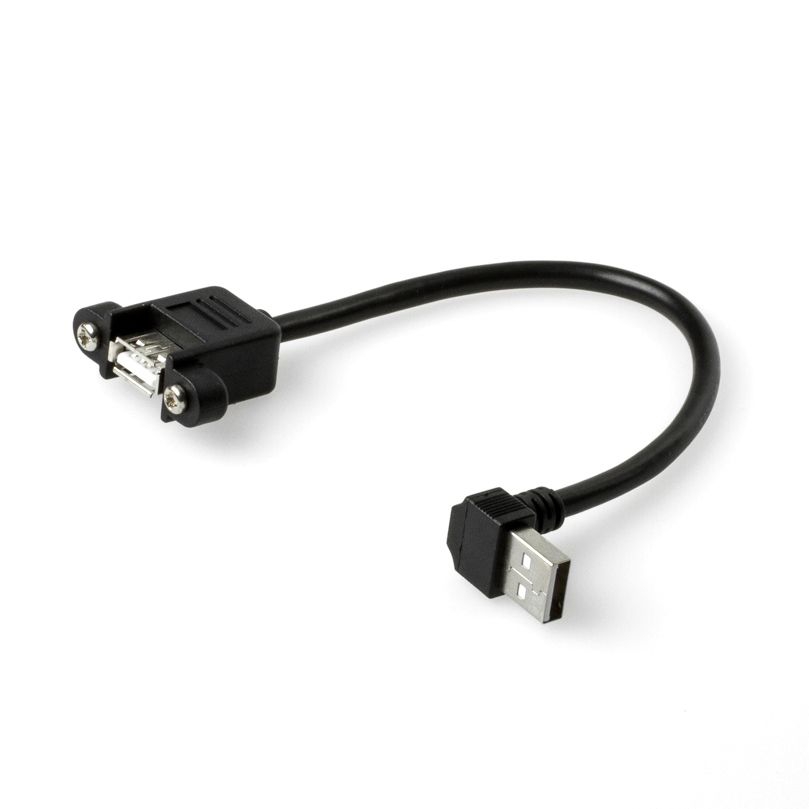 Mountable USB cable for industrial applications, plug type A (male, 90° angled UP) to type A female (mountable with 2 screws), 20cm, double shielded, twisted pair, for USB 1.1 und USB 2.0 (up 480 MBit/s)