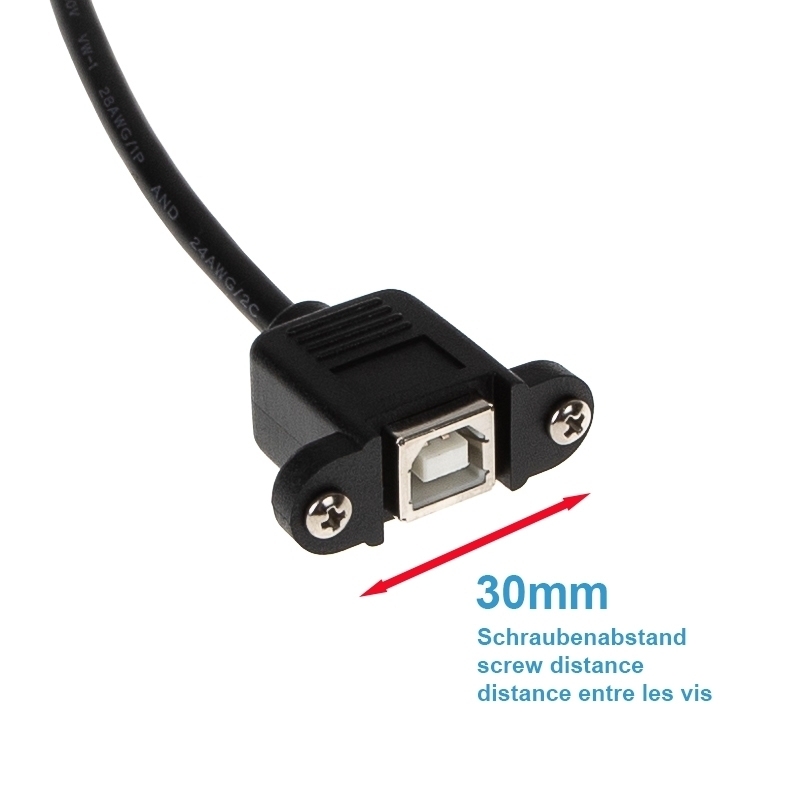 Mountable USB cable for industrial applications: female connector type B (mountable with 2 screws) to board connector (5-pin version, grid 2.54mm), 2m, double shielded, twisted pair, for USB 1.1 und USB 2.0 (up 480 MBit/s)