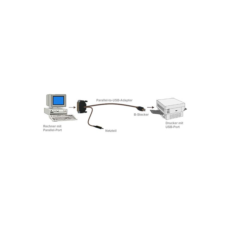 Adapter to connect printers and multifunction printers with an USB connection to the LPT(parallel) interface of PCs, measuring devices, laboratory and diagnostic devices, control panels, medical devices as well as all other products with a parallel interface.