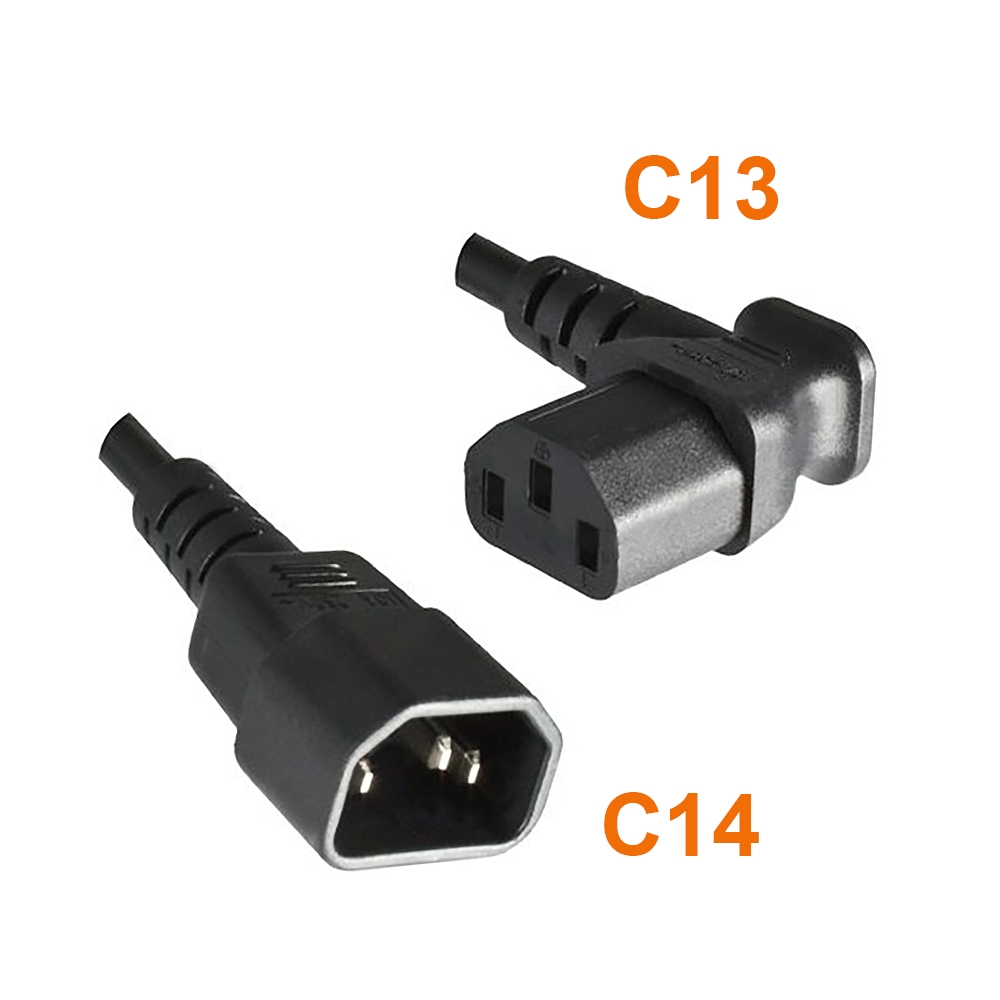 Power cord extension with angled plug, 1.8m, standard power plug (female) to standard power plug (male), C13 angled 90° to C14, for international use, 3 x 0,75mm², VDE