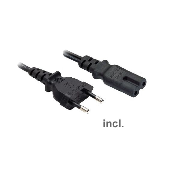 External power supply +5/+12V (2A each), with 5.25" power plug (type 4-pin Molex) and SATA power plug for harddisks, AC 100-240V~ 50-60Hz, power cord included (Euro8)