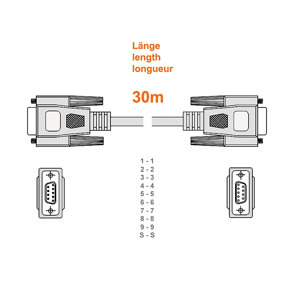 Serial cable DB9 male to DB9 female, 30m, e.g. for RS232