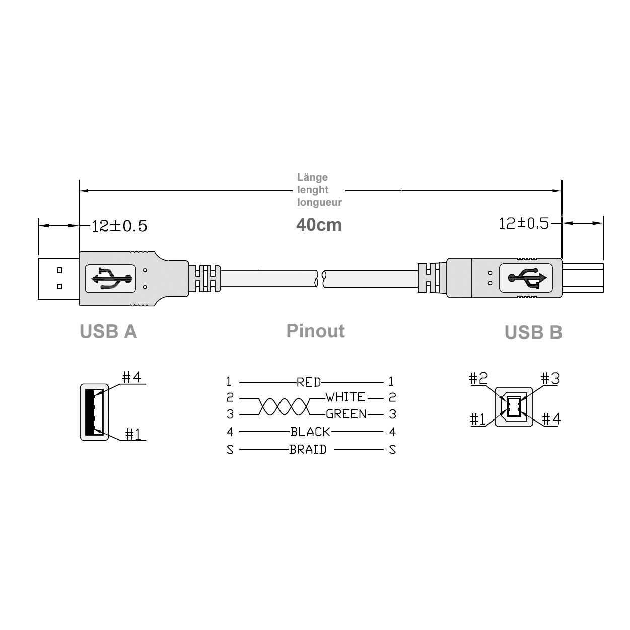 Short USB cable, 40cm total length (2x plug 5cm + 30cm cable), for USB 2.0 + USB 1.1, high quality (28AWG1P / 24AWG2C), USB plug A to USB plug B, colour: silver translucent