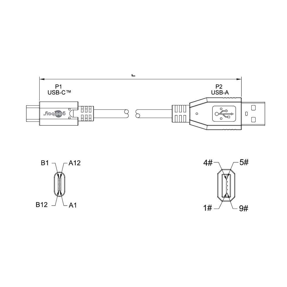 Short USB cable Type-C™ male to USB 3.0 A male 15cm