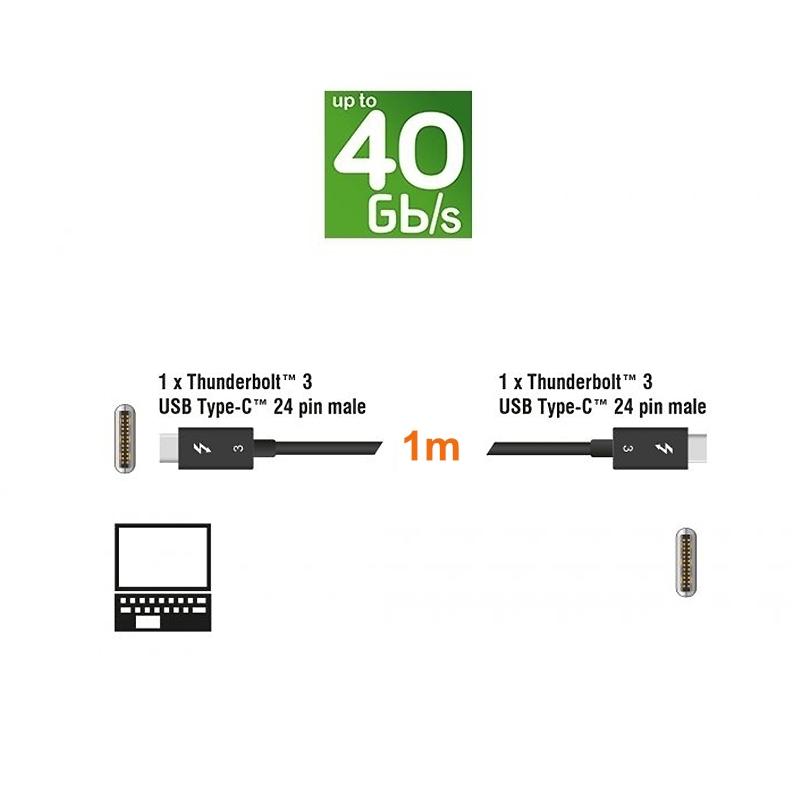 Thunderbolt 3 cable, C to C, 40 Gbps, 100W, 5A, 1m