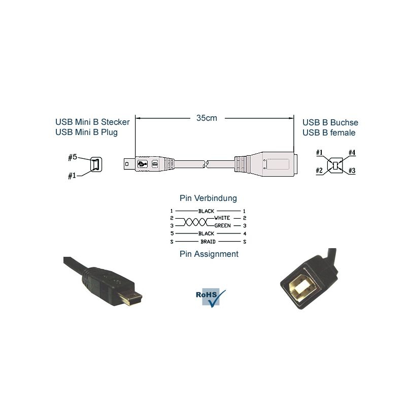 USB 2.0 adapter cable with USB B female to USB Mini B male, 35cm