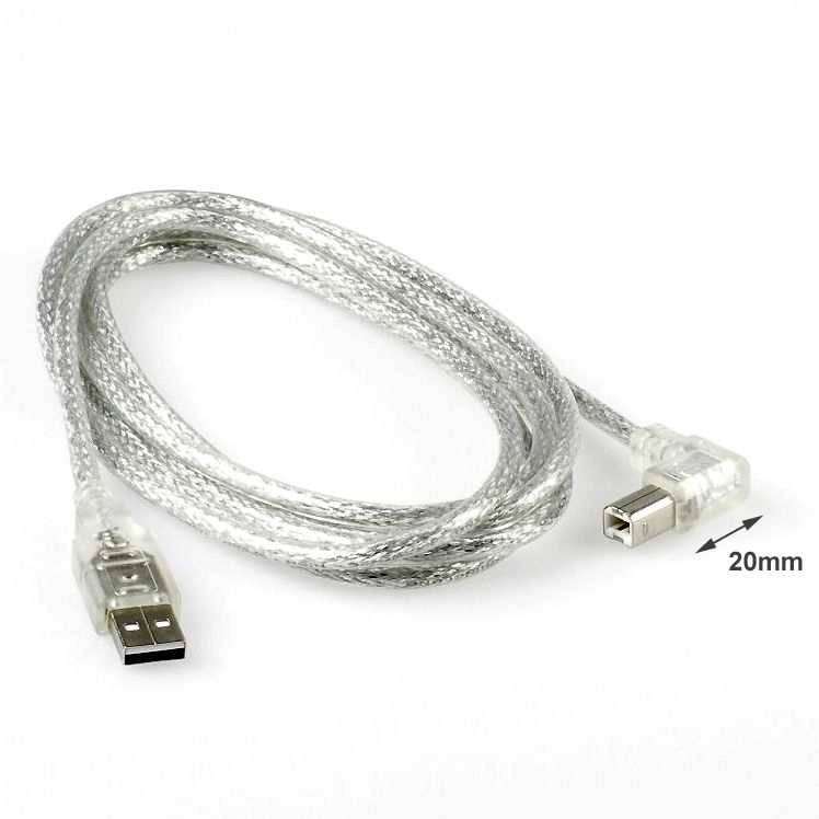 Angled USB cable, B plug 90° angled (RIGHT) to A plug straight, 2m, high quality: USB 2.0 high speed, 480Mbps, 28AWG/1P 24AWG/2C, double shielded, colour: silver translucent