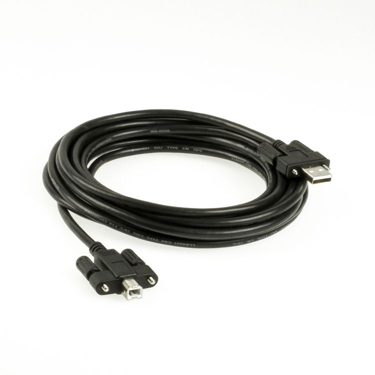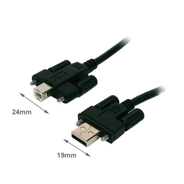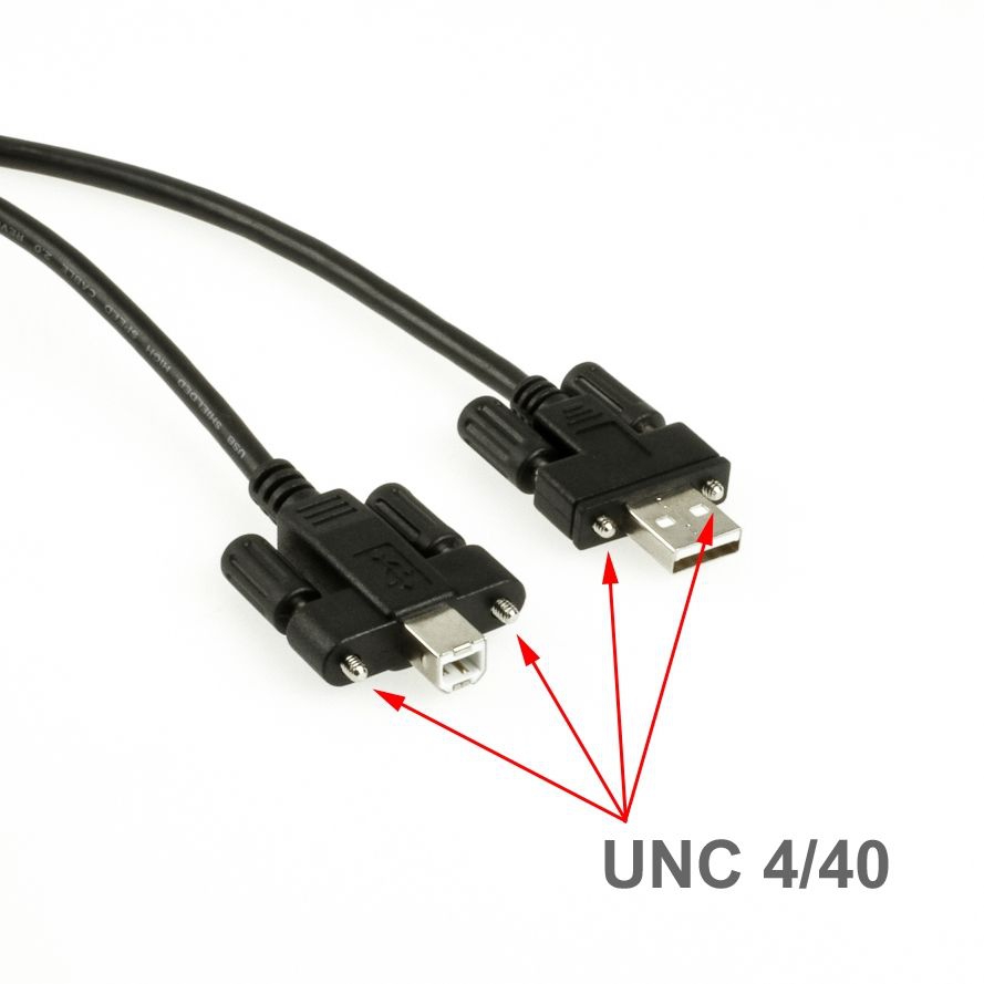 USB cable AB with screws on both sides, 5m, for USB 2.0 + USB 1.1, high quality, screw distance: plug USB A 19mm, plug USB B 24mm, screw type UNC4-40, black