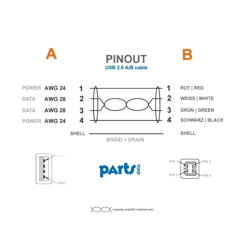- Wire colours, internal: white, green, red, black (according to USB standard)