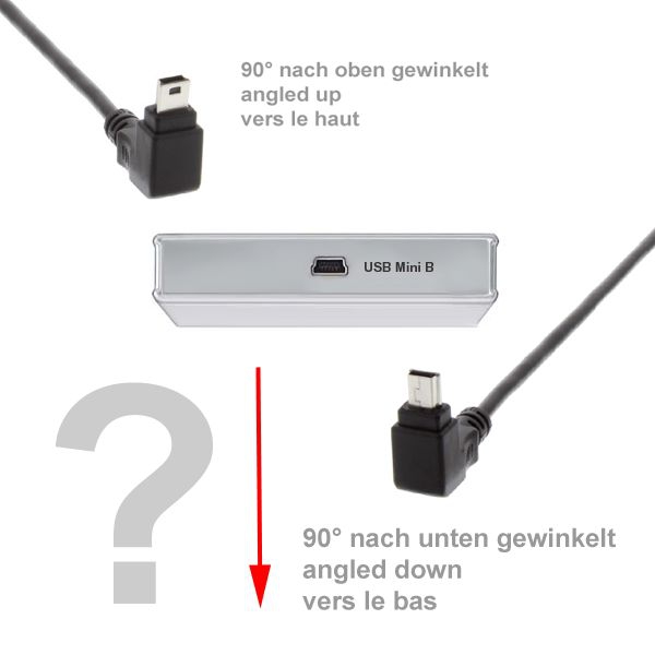 - Angled DOWN means: 90° angle to the wide side of the MINI B connector