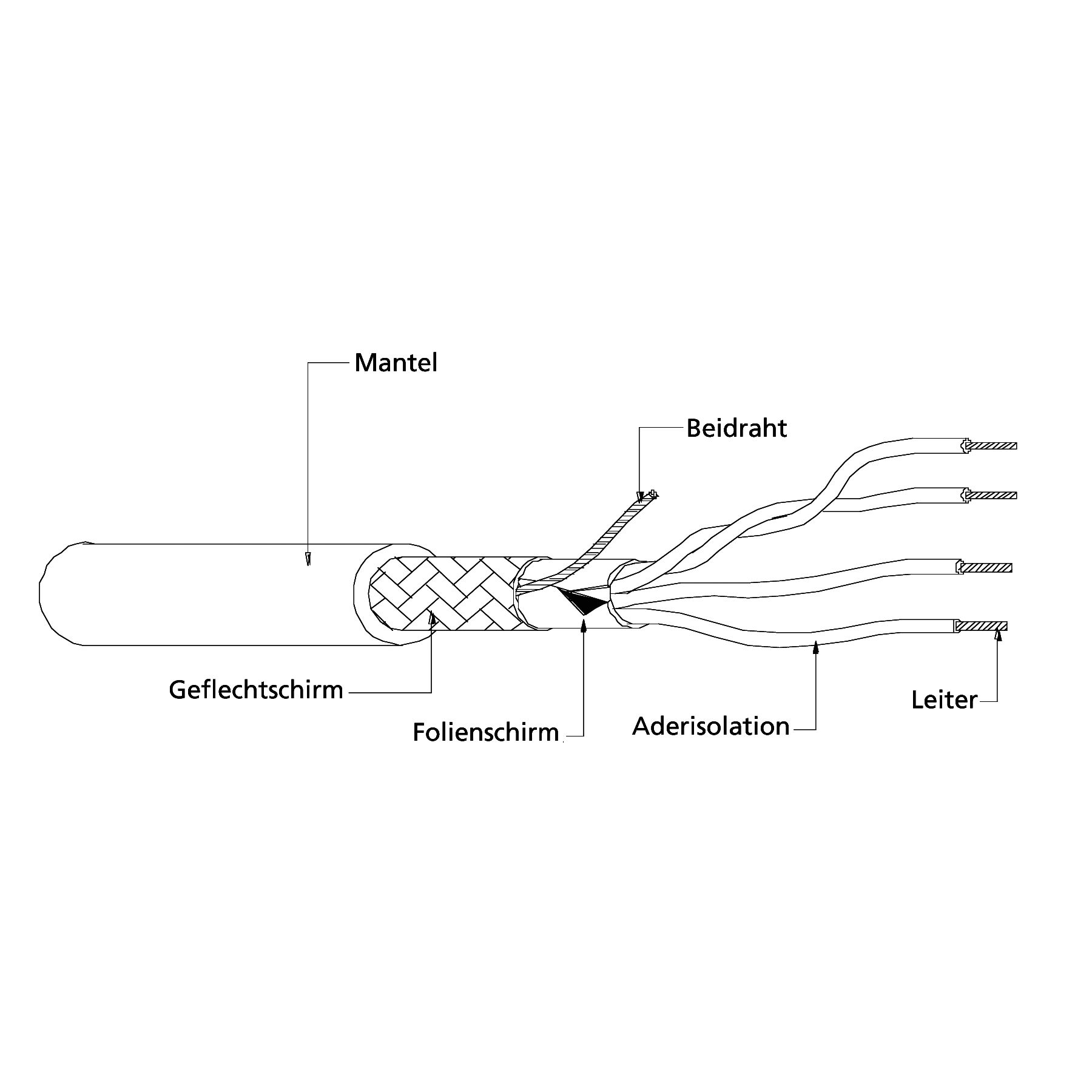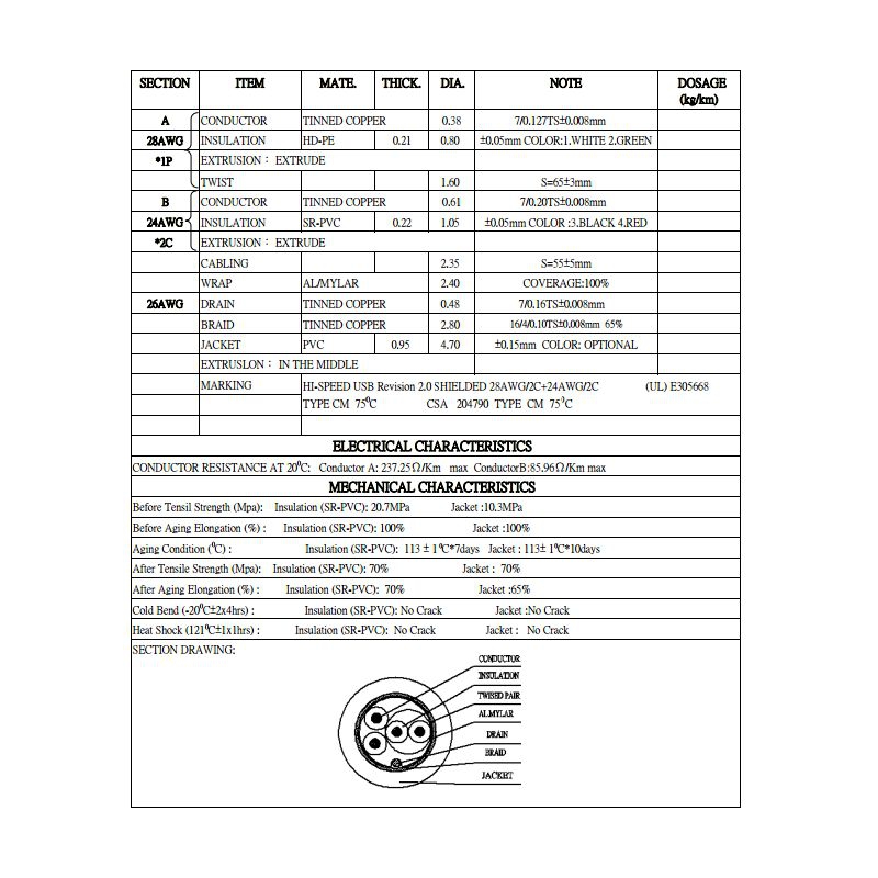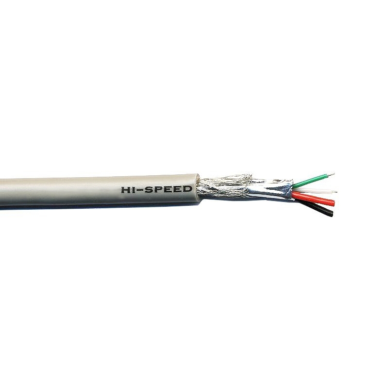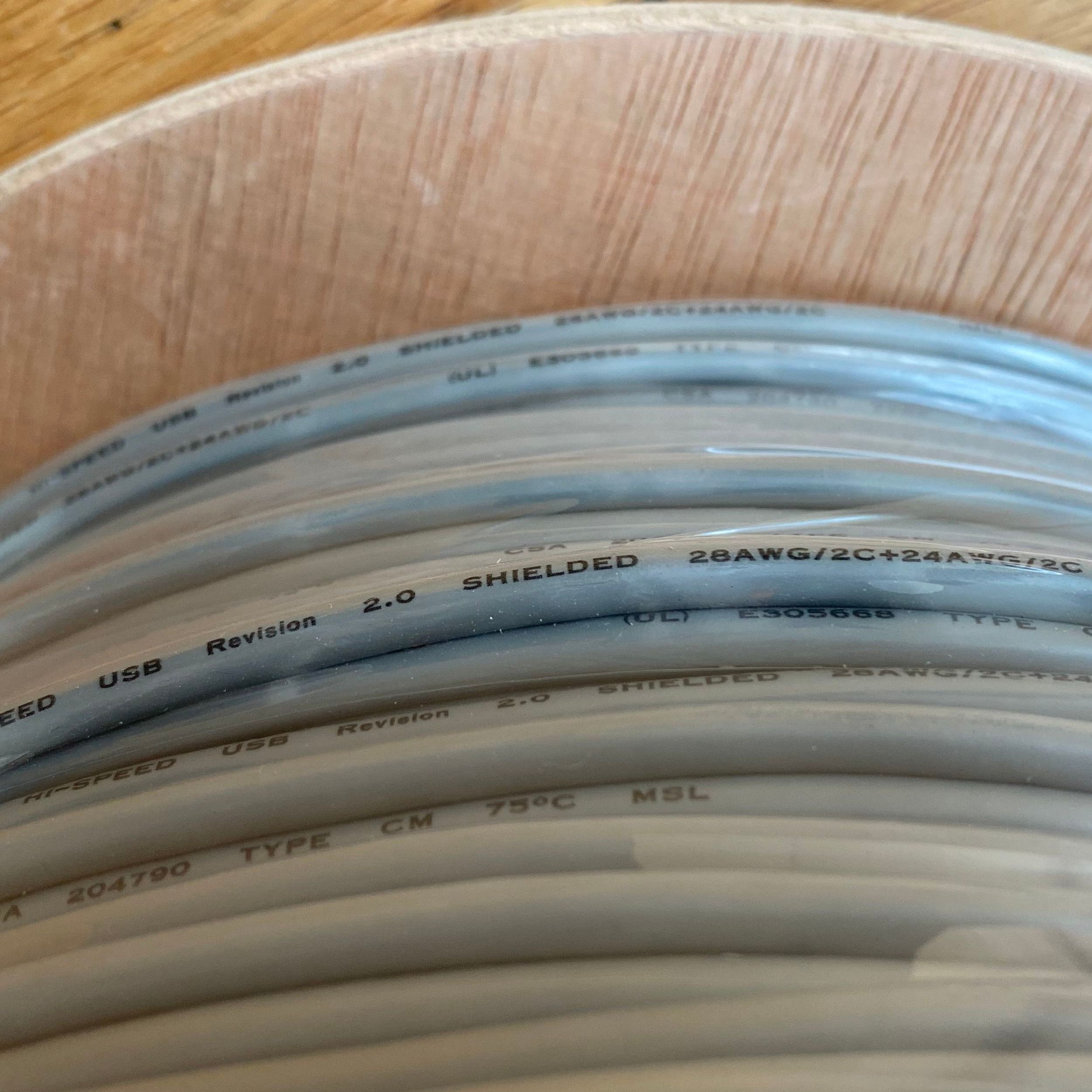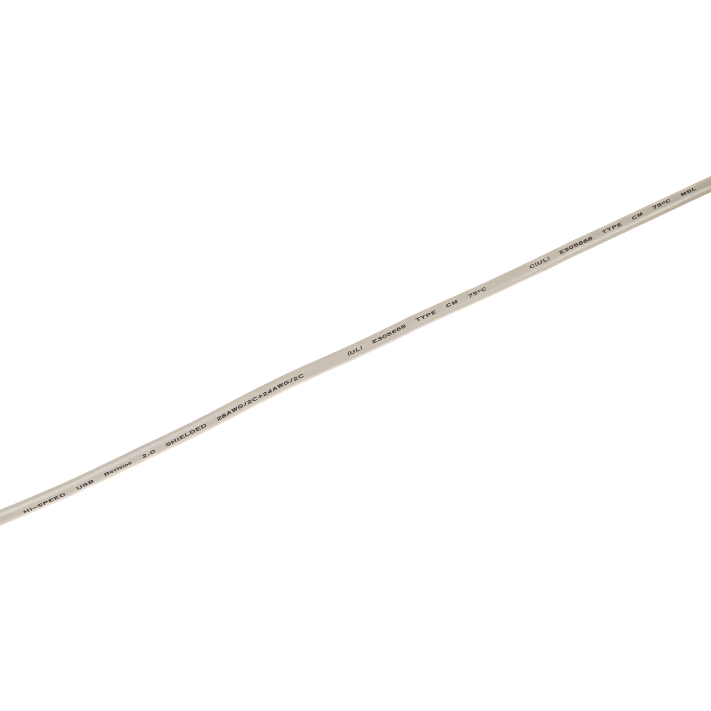 USB 2.0 cable, roll 500m, material meets USB standard: AWG28/1P (twisted pair data connection) AWG24/2C (5V power connection), double shielded (Al foil + braid shield), compatible USB 2.0, diameter 4,5mm, colour: grey
