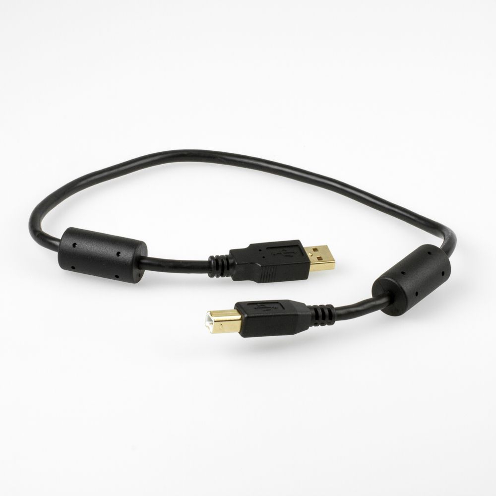 USB cable 50cm, USB 2.0, very high quallity for INDUSTRIAL APPLICATIONS: 2x ferrite core, 26AWG/1P 20AWG/2C, double shield foil + braid (85% coverage), 30 µm gold plated plugs, USB-A male to USB-B male, black
