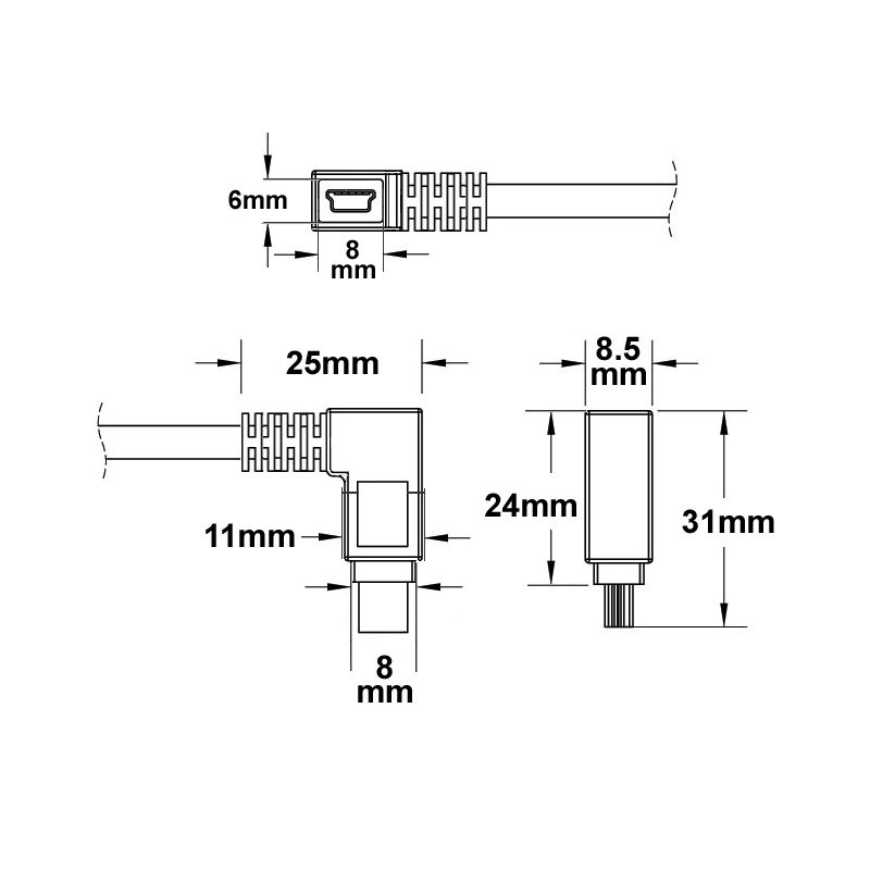 - Connection 1: USB 2.0 plug type Mini B 90° angled RIGHT (to peripheral device/downstream)