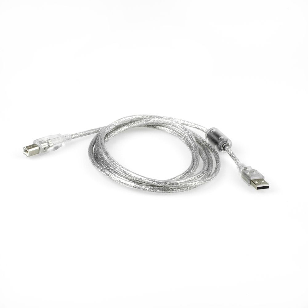 USB cable with ferrite core, 2m, very high quality: 28AWG/1P 24AWG/2C, double shield (covering 65%), for USB 2.0 high speed 480 Mbps, colour: silver translucent