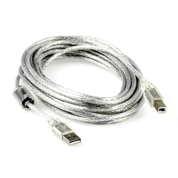 USB cable with ferrite core, 5m, very high quality: 28AWG/1P 24AWG/2C, double shield (covering 65%), for USB 2.0 high speed 480 Mbps, colour: silver translucent