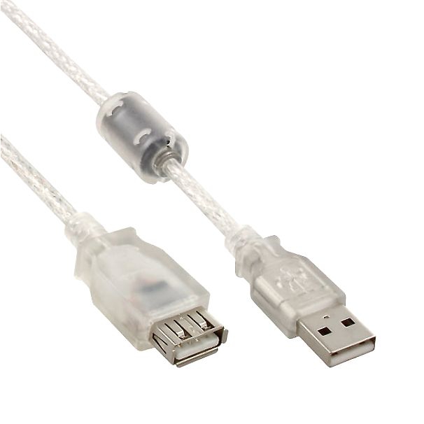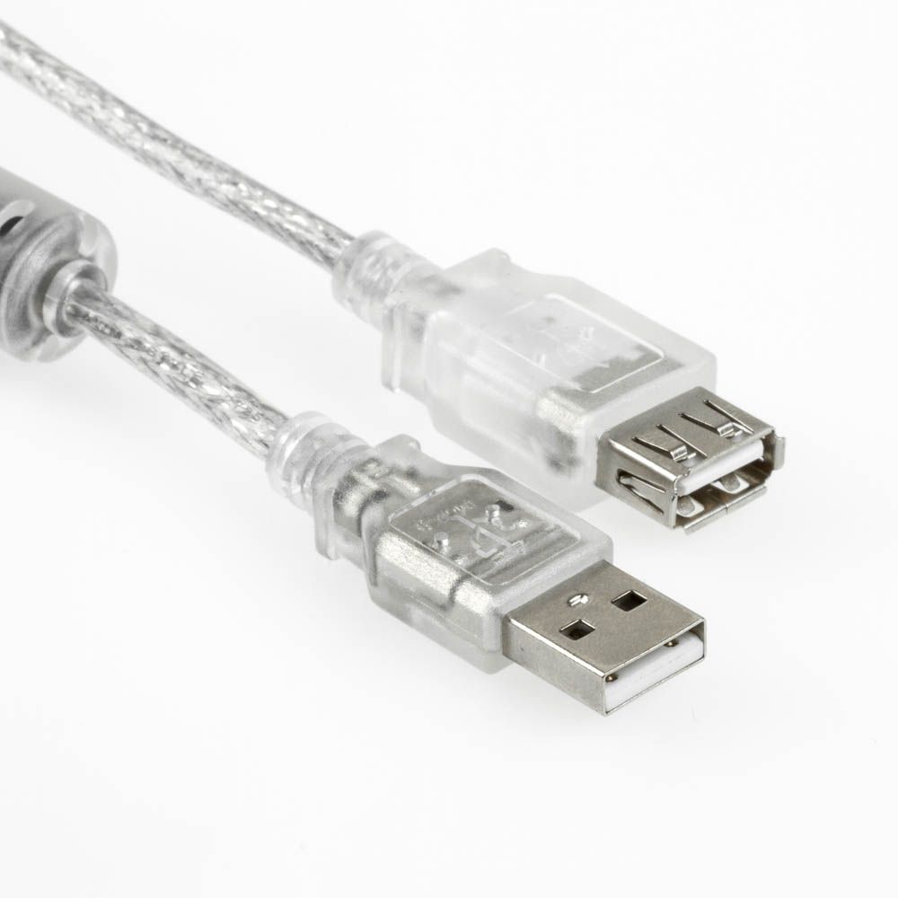 USB 2.0 extension cable, type A male to type A female, with ferrit core, 5m, colour: translucent silver