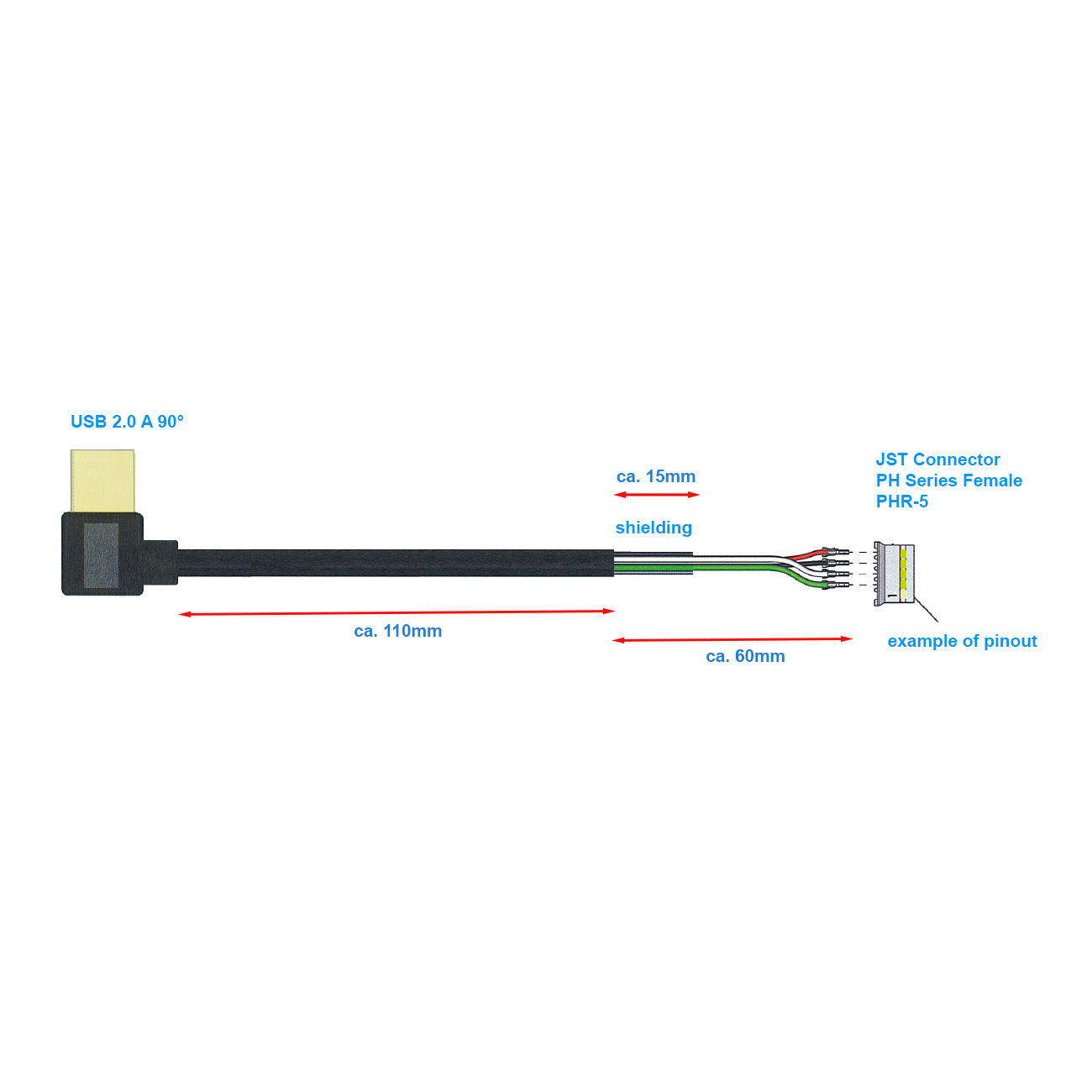 USB 2.0 special cable: USB 2.0 A plug angled 90° to the right to JST Connector PH Series Female PHR-5 (contacts not yet plugged in), length approx. 19cm