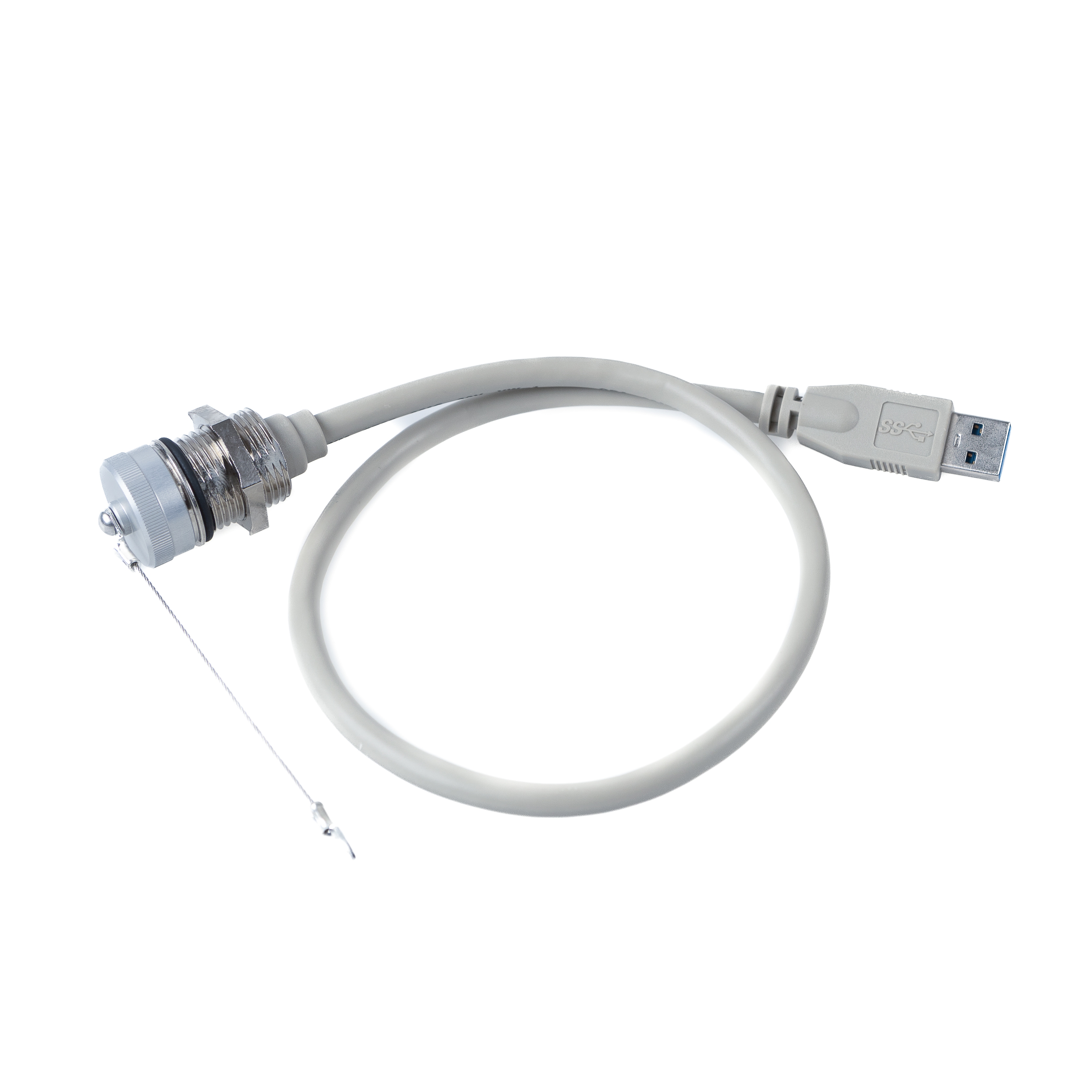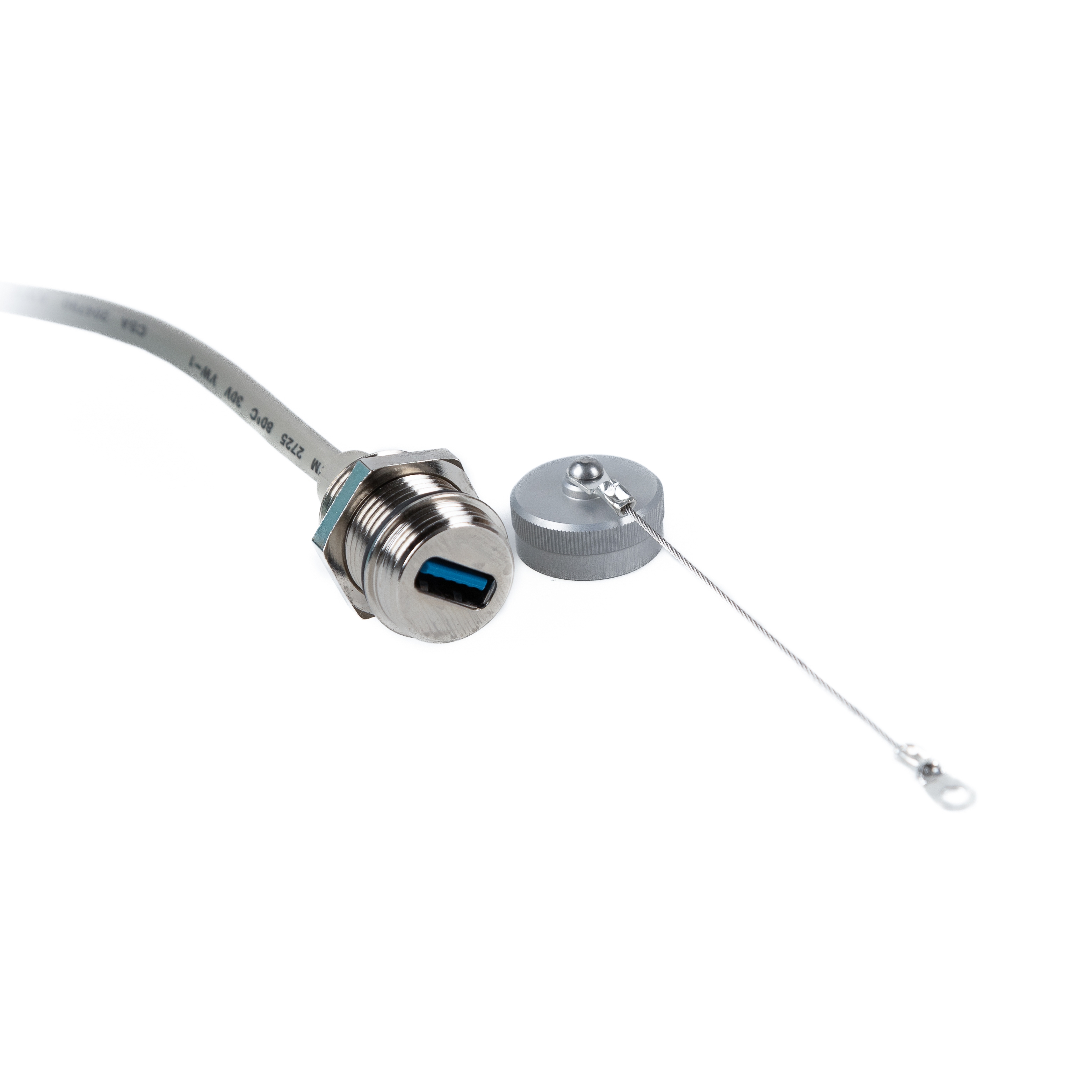 USB 3.0 panel mounting cable: A female with screw cap (IP67 protection against dust and moisture) to A male, cap with wire rope (external), high-end metal version, 50cm
