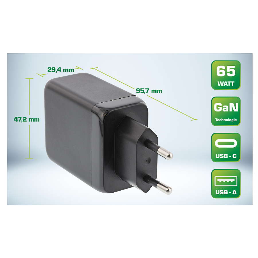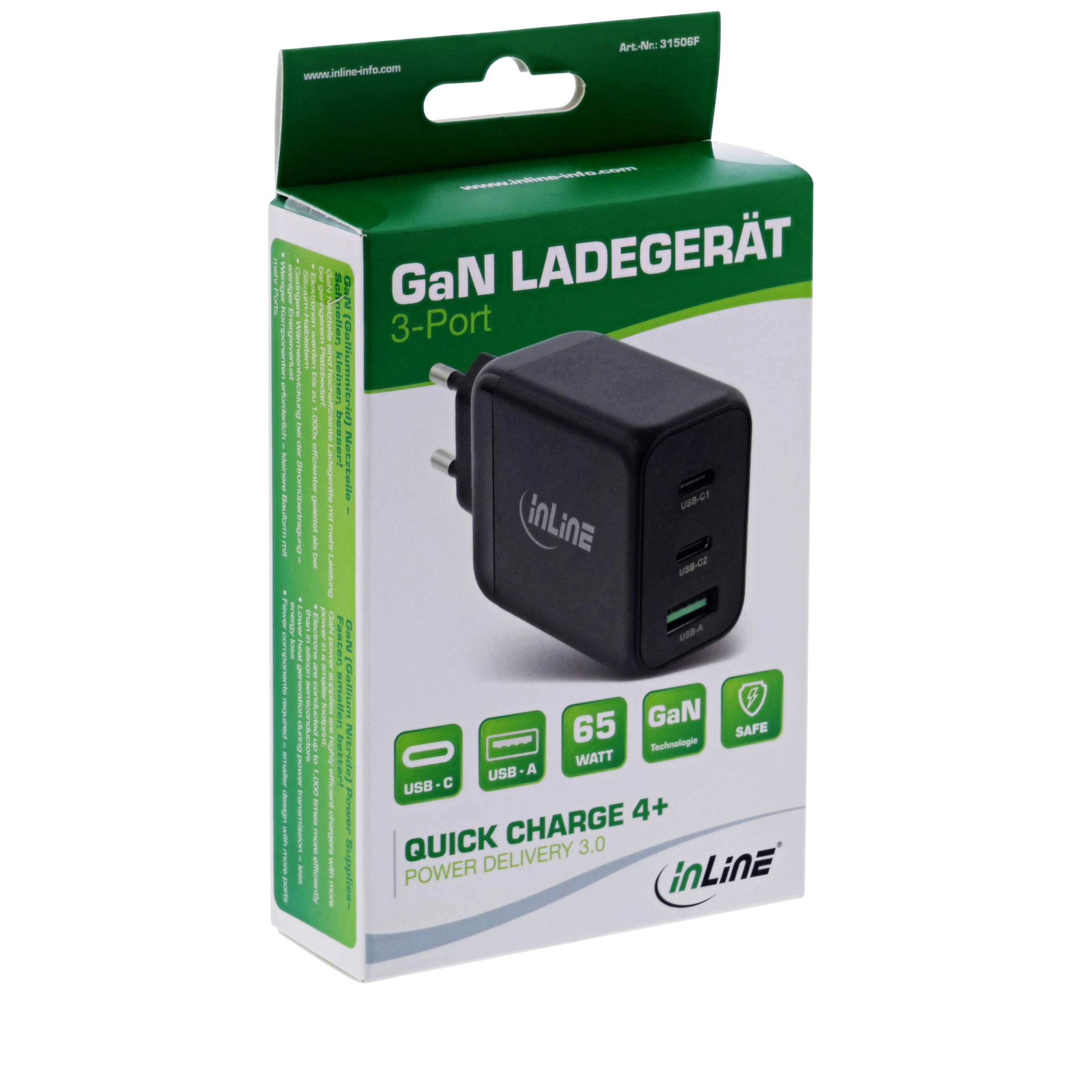 INLINE USB PD power supply, GaN technoloy (Gallium Nitride), 3-port, Dual USB-C + USB-A, 65W