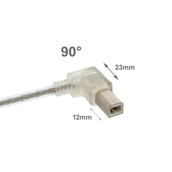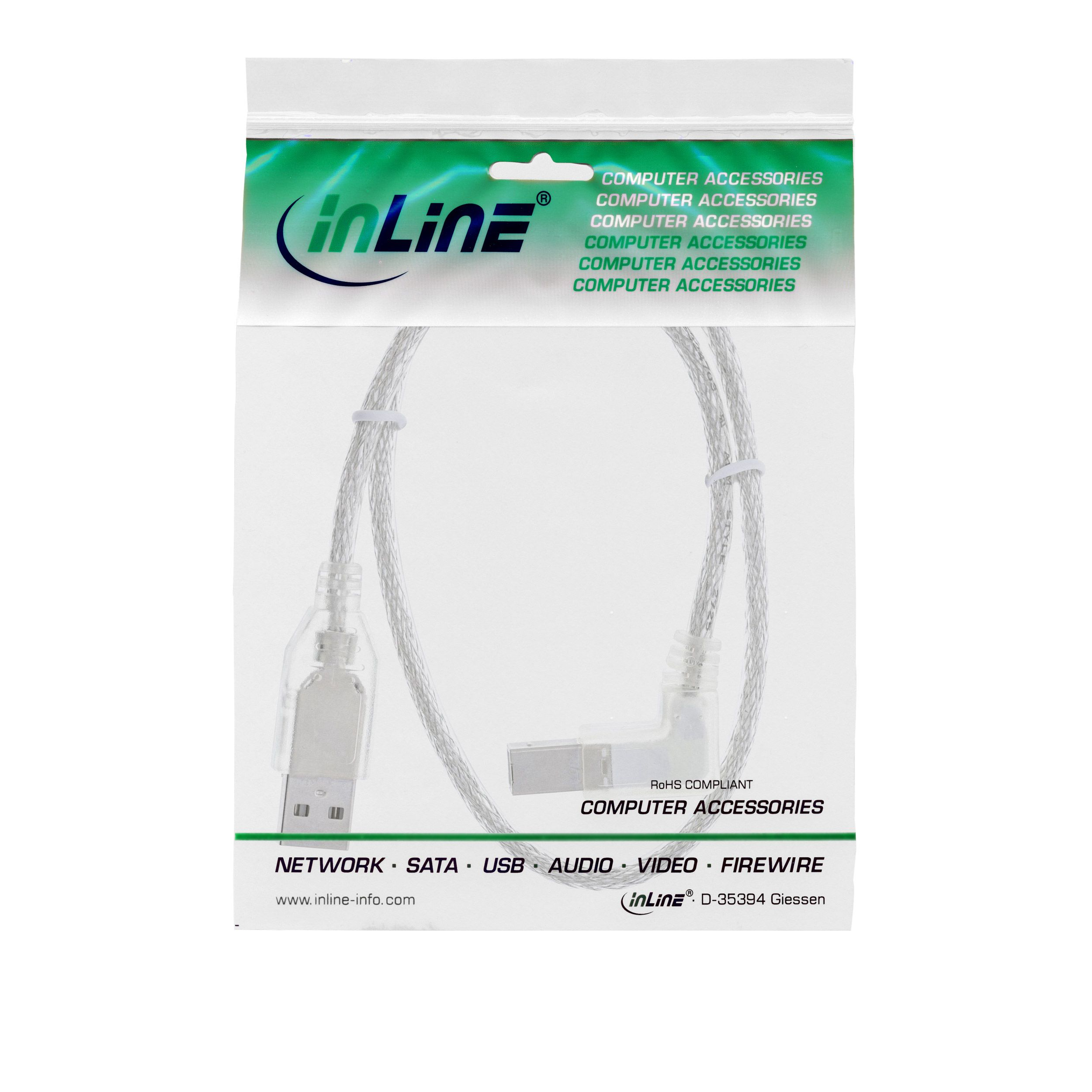 Angled USB cable, B plug 90° angled (RIGHT) to A plug straight, 5m, high quality: USB 2.0 high speed, 480Mbps, 28AWG/1P 24AWG/2C, double shielded, colour: silver translucent