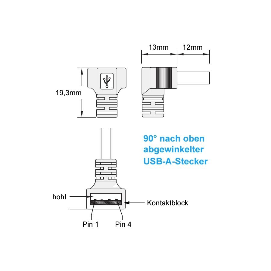 Angled USB cable, A plug 90° angled (UP) to B plug straight, 2m, for USB 2.0 and USB 1.1, high quality: double shielded, AWG28/1P AWG24/2C, colour: black