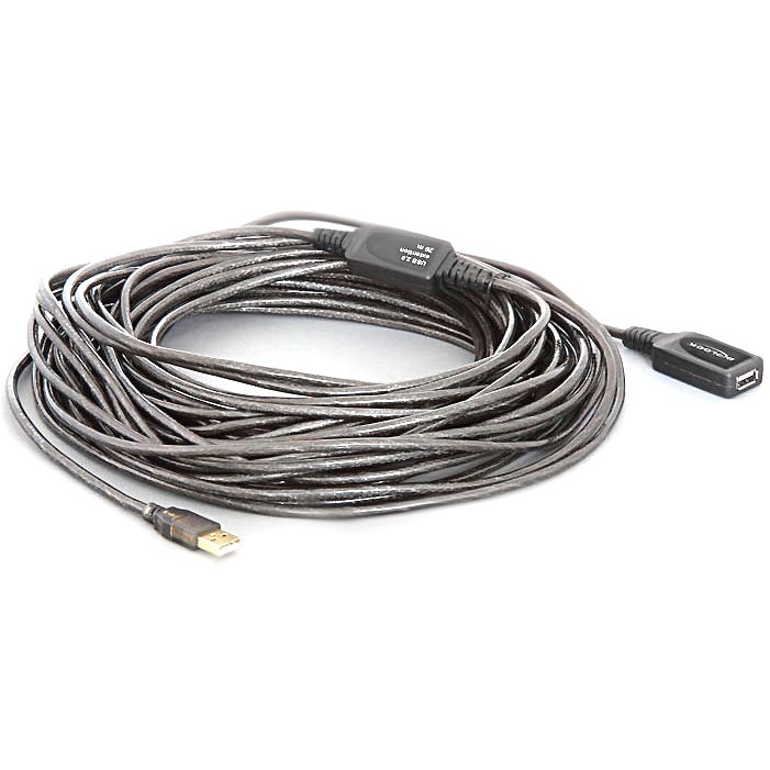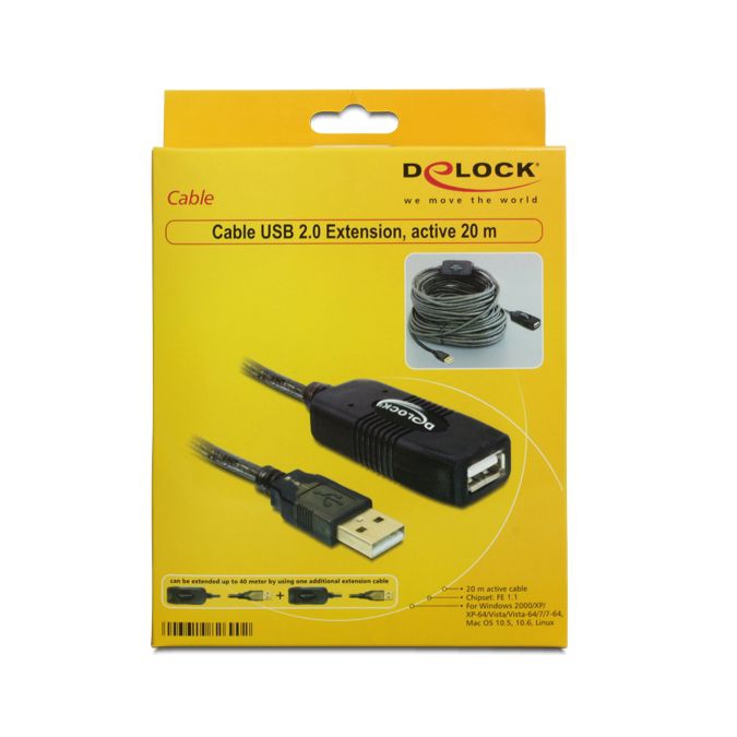 20m active USB 2.0 extension / USB 2.0 repeater cable: USB A plug male to USB A female, with integrated amplifier module (booster) in the middle of the cable, with chip set FE 1.1 (Windows 7 + VISTA certified) from Terminus-Technology Inc.