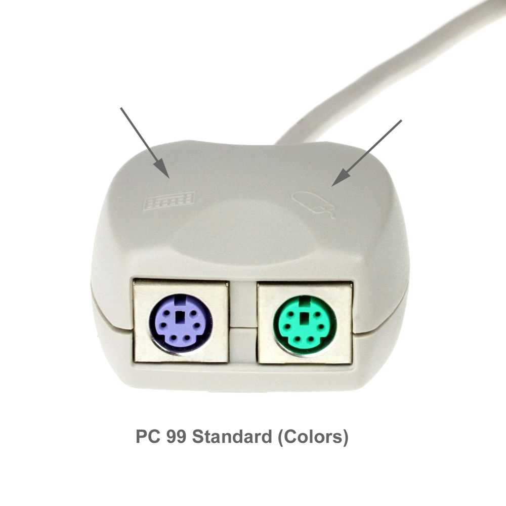 The PS/2 mouse is connected to the green PS/2 socket on the adapter. The colour coding of the sockets corresponds to the PC99 standard (see en.wikipedia.org under "PC System Design Guide"). In addition to the colour coding, the 2 ports are also identified by symbols on the adapter (see illustration).