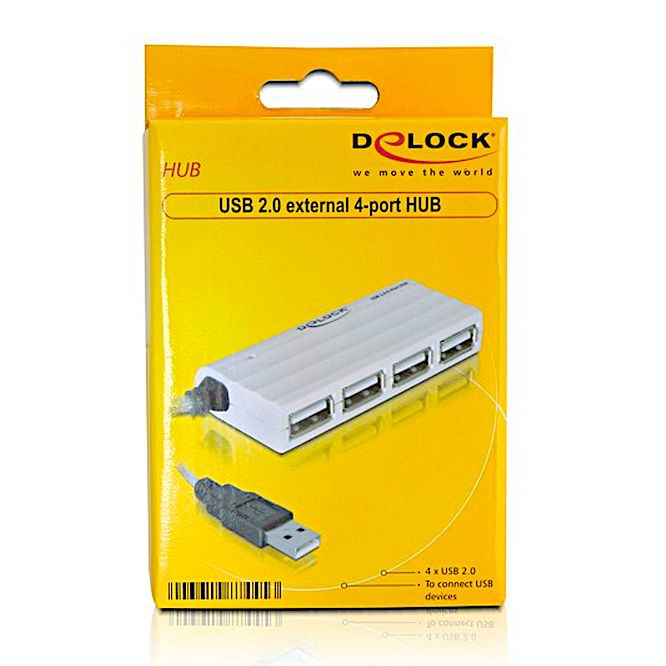 This USB hub by Delock can be connected to a computer via the USB Type-A interface. It expands the computer by four USB Type-A connectors. Different USB devices such as docking stations, card reader, external enclosure etc. can be connected.