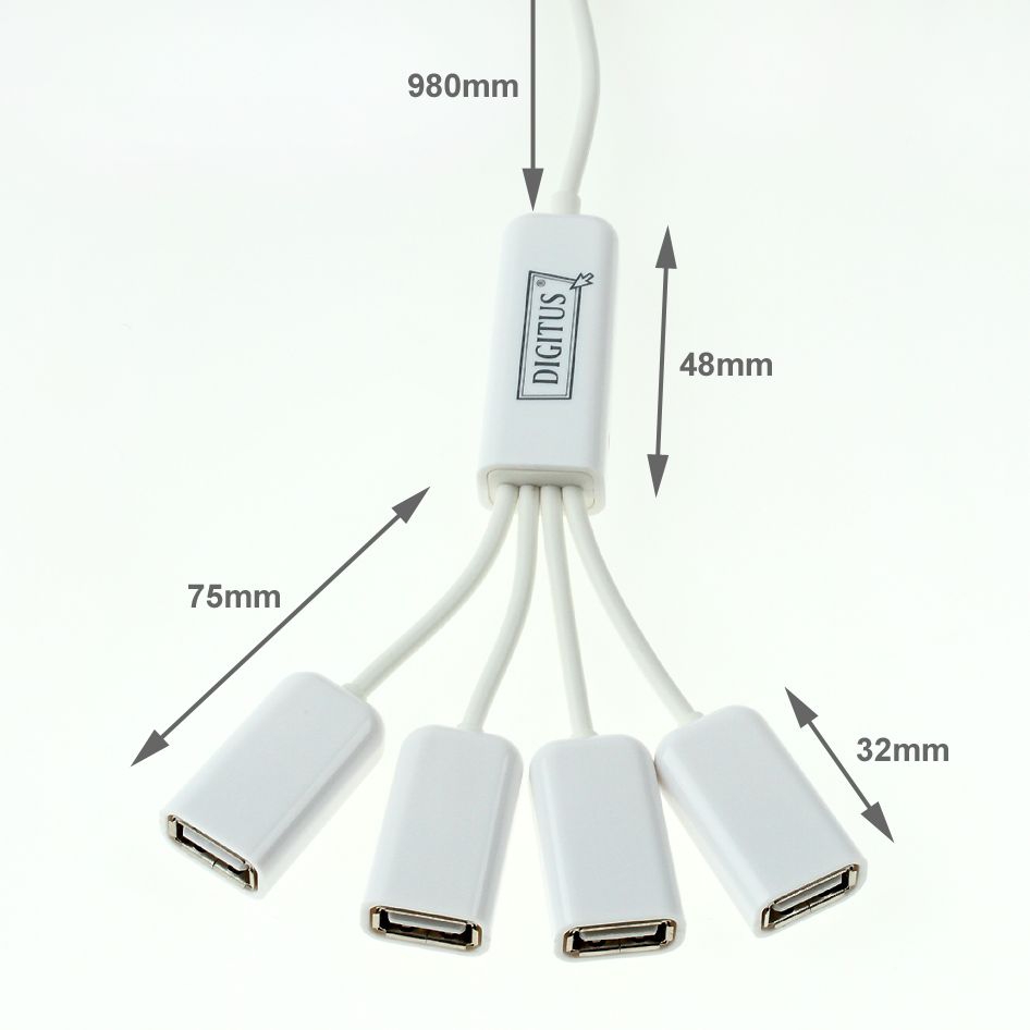 USB-HUB cable solution, 4 ports, USB 2.0 works bus bowered (without power supply), USB 2.0 FE1.1 chipset of Terminus Technology Inc., white